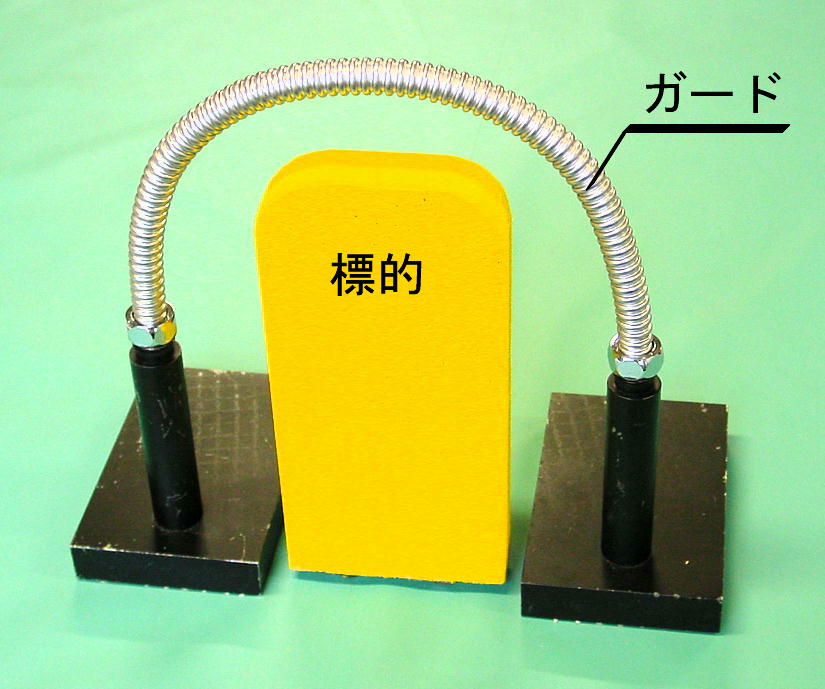 | 標的 | 幅110mm, 高230mm, 奥行30m のスタイロフォームの底に,M12のボルト2本を下から差し込み,ボルトの頭で立つように設置します.上部を押すと倒れます.エリア上の標的は2個で,エリアの左側と右側に置きます. | ![]() ![]() |