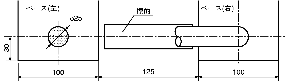 | 設置形態 | 標的の周囲は図のようにガードが設置されています.ガードを固定するためにベース板に 25mm 厚の鋼材を使用しています。ベース板と標的の位置関係はおおよそ右図の通りです. | ![]() |