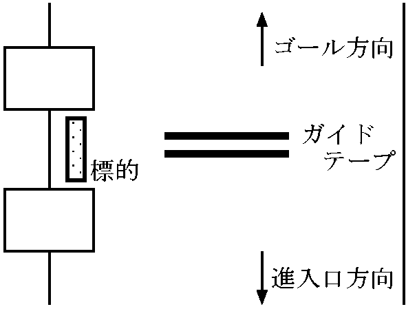 | ガイドテープ | 標的のある方向を示すため、ガイドテープを路面の中央部に,進行方向に対して垂直に貼ります.テープが2本のときには左側に,3本のときには右側に標的があります.テープの長さは500mm,テープの間隔は中心間距離で50mmです. | ![]() |