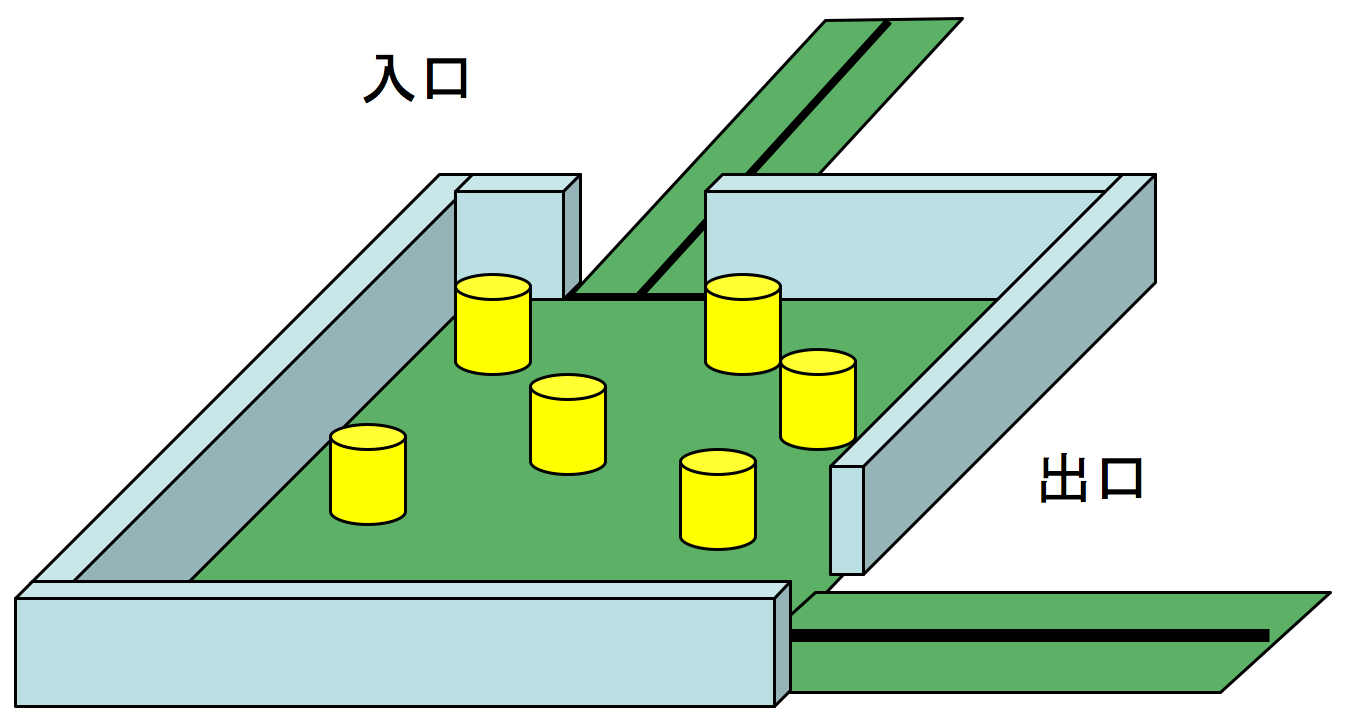 | 障害物 | 直径125mm、高さ150mm 程度の円筒型の障害物が6つあります。色は黄色です。標準ロボットでは、動かしたり、持ち上げることのできない程度の重量です。障害物の配置は当日決めますが、少なくとも直径30cmの円盤が通過できるような通路を確保します。 |